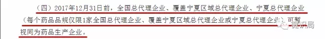 (四)2017年12月31日前,全國總代理企業(yè)、覆蓋寧夏區(qū)域總代理企業(yè)、寧夏總代理企業(yè)(每個藥品品規(guī)僅限1家全國總代理企業(yè)、覆蓋寧夏區(qū)域總代理企業(yè)或?qū)幭目偞砥髽I(yè))可暫視同為藥品生產(chǎn)企業(yè)。