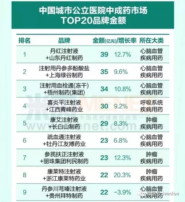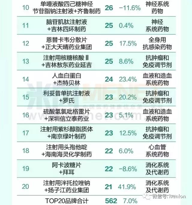 全國醫院市場銷售超10億的20個藥品