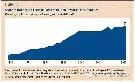 如果我們看美國的話,有一大批幾十年的基金管理公司,從Vanguard ,Templeton,到Fidelity,Capital等。毫無疑問美國擁有一大批全球資產(chǎn)規(guī)模最大的基金公司。根據(jù)2013年底的數(shù)據(jù),美國資產(chǎn)管理公司規(guī)模14.7萬億美元,其中13萬億來自于共同基金。其中有一個(gè)重要的時(shí)代背景:過去30年美國經(jīng)濟(jì)的高速發(fā)展,大幅甩開了日本,歐洲這些追趕者。這也導(dǎo)致美國企業(yè)受益于這30年的大發(fā)展,最終早就了一波大牛市。道瓊斯指數(shù)在1980年還只有1000點(diǎn),到了2000年突破了10000點(diǎn),20年上漲10倍。這也導(dǎo)致家庭資產(chǎn)在共同基金的配置也大幅提高。從1980年的3%提高到了今天的25%。