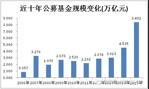 我們先說說公募基金。下圖是2006到2015年公募基金規(guī)模的變化。可以看到整個(gè)公募基金的規(guī)模一定是在牛市最高點(diǎn)達(dá)到頂峰的。這也和商業(yè)模式有關(guān)。公募基金主要還是靠管理費(fèi)賺錢,規(guī)模越大收入越高。而且在牛市最癲狂的時(shí)候一定是基金最好發(fā)的,大量基金公司通過發(fā)行新產(chǎn)品完成了規(guī)模的跳躍。事實(shí)上,2007年牛市見頂后,如果僅僅看股票類資產(chǎn)規(guī)模的話,到了2014年還沒有真正回到07年的水平。在七年的“熊市”中,基金公司的資產(chǎn)規(guī)模主要通過貨幣,債券等產(chǎn)品做大。
