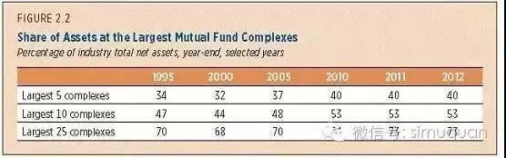 最后的結(jié)果是什么?行業(yè)集中度提高。因?yàn)榇蠡鸸酒放拼螅缽V,產(chǎn)品線也豐富,所以1995年到2012年,整個(gè)市場(chǎng)規(guī)模最大的5家資產(chǎn)管理公司市場(chǎng)份額從34%提高了40%。整個(gè)前25的資產(chǎn)管理公司,管理的市場(chǎng)份額達(dá)到73%。