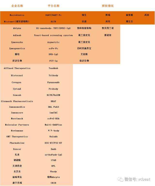 目前全球正在使用的技術(shù)平臺(tái)超過(guò)30個(gè),其中,MacroGenics公司的DART平臺(tái)被強(qiáng)生、輝瑞、施維雅、武田等多家制藥巨頭采用。