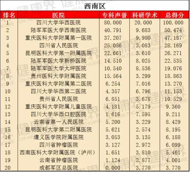 該榜單在2015年首次亮相,就成為最大亮點,并引發廣泛關注。它將東北區、華北區、華東區、華南區等7個區域醫院分別作為獨立單元,評選出各地區醫院綜合實力排名,旨在提高區域醫療水平,同時便于區域民眾詢醫就診。這意味著,看病不一定要去全國最好的醫院,在自己所處區域也能找到好醫院。