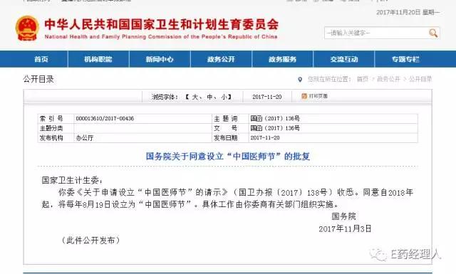 你委《關于申請設立“中國醫師節”的請示》(國衛辦報〔2017〕138號)收悉。同意自2018年起,將每年8月19日設立為“中國醫師節”。具體工作由你委商有關部門組織實施。