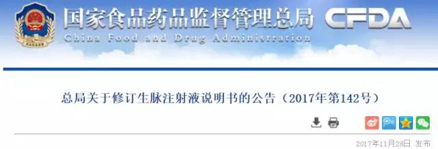 11月28日,國家食藥監總局(CFDA)發出公告,根據藥品不良反應評估結果,為進一步保障公眾用藥安全,總局決定對生脈注射液說明書增加警示語,并對【不良反應】、【禁忌】和【注意事項】項進行修訂,