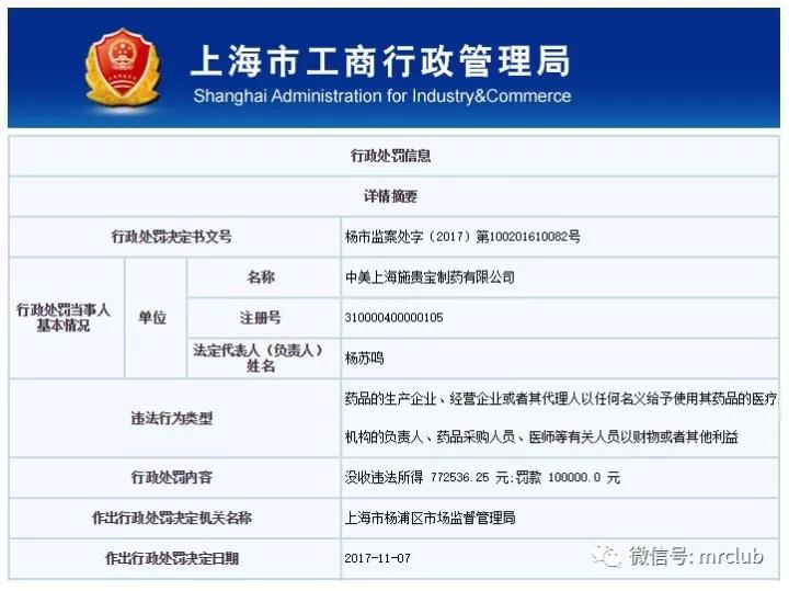 上海市工商行政管理局近日向公眾公示了“中美上海施貴寶制藥有限公司違規銷售藥品案”的行政處罰信息及行政處罰決定書(見下圖),按照信息顯示,施貴寶被公示的違法行為類型是:藥品的生產企業、經營企業或者其代理人以任何名義給予使用其藥品的醫療機構的負責人、藥品采購人員、醫師等有關人員以財物或者其他利益。