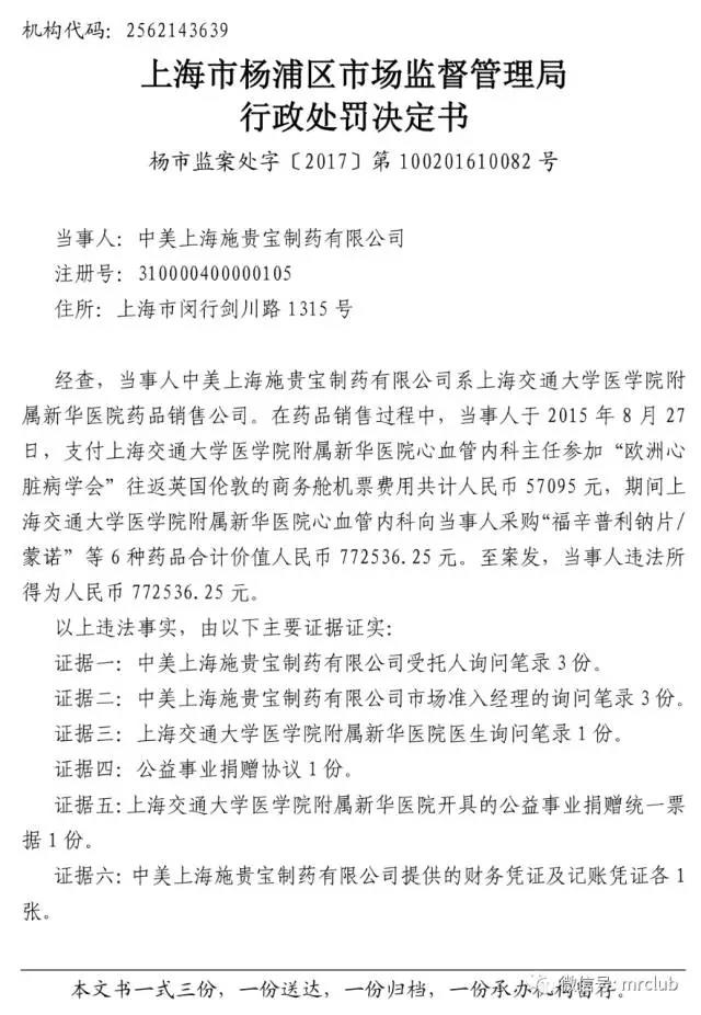 處罰決定書顯示詳情為,施貴寶支付上海交通大學醫學院附屬新華醫院心血管內科主任參加“歐洲心臟病學會”往返英國倫敦的商務艙機票費用共計人民幣57095元,期間上海交通大學醫學院附屬新華醫院心血管內科向當事人采購“福辛普利鈉片/蒙諾”等6種藥品合計價值人民幣772536.25元。至案發,當事人違法所得為人民幣772536.25元。