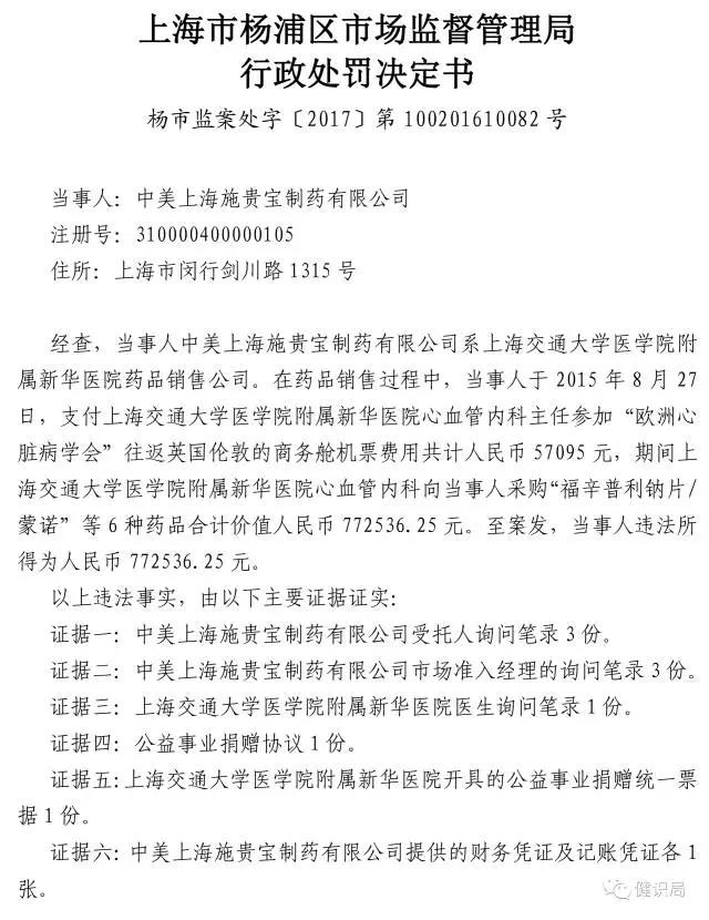日前,上海工商管理局官網公布一則行政處罰信息:中美上海施貴寶制藥有限公司(簡稱“施貴寶”)在藥品銷售過程中,于 2015 年 8 月 27日,支付上海交通大學醫學院附屬新華醫院心血管內科主任參加“歐洲心臟病學會”往返英國倫敦的商務艙機票費用共計人民幣 57095 元,期間上海交通大學醫學院附屬新華醫院心血管內科向當事人采購“福辛普利鈉片/蒙諾”等 6 種藥品合計價值人民幣 772536.25 元。