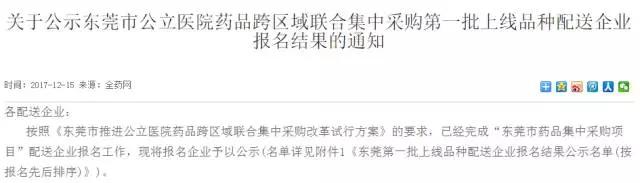 今日(12月15日),全藥網公示東莞市公立醫院藥品跨區域聯合采購第一批上線品種配送企業,公示時間為2017年12月15日11:30至2017年12月17日17:30。