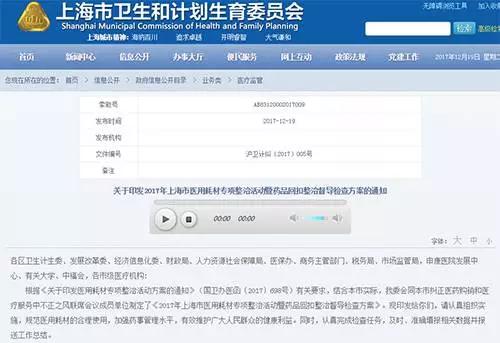 今日(12月19日),上海市衛生計生委公布《2017年上海市醫用耗材專項整治活動暨藥品回扣整治督導檢查方案的通知》。