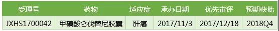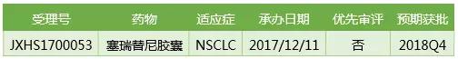 諾華提交的塞瑞替尼膠囊上市申請在2017/12/11正式獲得CDE承辦受理,后面被納入優先審評應該沒有懸念(臨床申請獲得過優先審評),預計可在2018Q4獲得CFDA批準。