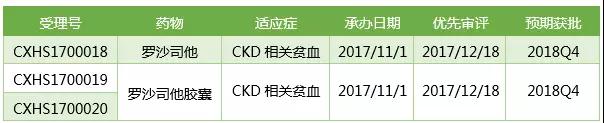 羅沙司他用于治療透析依賴性慢性腎病患者(DD-CKD)以及非透析依賴性慢性腎病患者(NDD-CKD)貧血的上市申請于2017/11/1獲得CDE承辦受理,在2017/12/18被CDE以"與現有治療手段相比具有明顯治療優勢"的理由納入優先審評,預計會在2018Q4獲得CFDA批準,有望成為首個率先在中國上市的first in class藥物(見:這款重磅first in class貧血新藥,將在中國率先上市)。羅沙司他在中國上市后的商業推廣工作由阿斯利康負責。