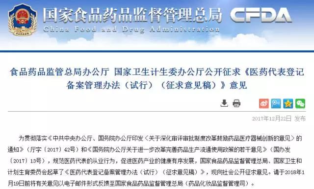12月22日,國(guó)家食品藥品監(jiān)督管理總局、國(guó)家衛(wèi)生和計(jì)劃生育委員會(huì)聯(lián)合發(fā)布《醫(yī)藥代表登記備案管理辦法(試行)(征求意見稿)》,規(guī)定醫(yī)藥代表須由藥品上市許可持有人負(fù)責(zé)平臺(tái)備案,并且只能通過以下五種形式與醫(yī)務(wù)人員進(jìn)行溝通