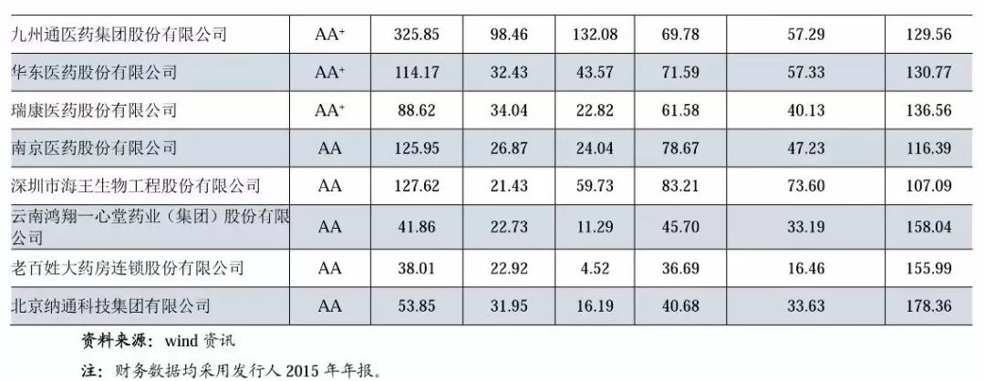 (3)從發債企業各級別序列的財務指標中位數來看,不同信用等級的發行人資產規模、收入規模和利潤總額均有非常顯著的差別,且隨著信用等級的上升,整體的財務指標也隨之向好。但從營業利潤率的中位數來看,與級別序列呈反相關,表現為AA>AA+>AAA,AA+企業中華東醫藥毛利率較高的醫藥工業業務占比較大,瑞康醫藥的醫療器械流通業務(毛利率比純藥品流通高)規模較大,使得AA+企業營業利潤率偏高。AA企業中老百姓大藥房和一心堂主營醫藥零售,納通科技主營醫療器械流通,上述業務毛利率普遍高于純藥品流通業務。從資產負債率的中位數來看,AA+企業資產負債率最低,主要系華東醫藥和瑞康醫藥整體負債率低于行業平均水平所致。