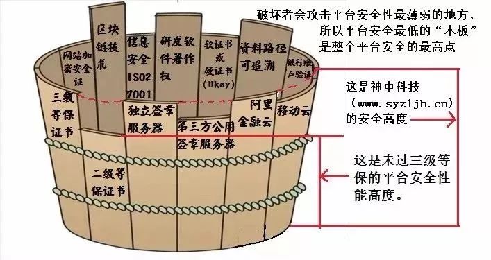 網站的加密、用戶身份的認證、獨立的簽章服務器(第三方的簽章服務器是各行各業、個人和企業公用的,類似于自家廁所和公共廁所的區別)、存儲的云服務、三級等保、著作權、研發迭代、信息安全認證ISO27001,可追溯的業務邏輯、銀行賬戶驗證等一些列的安全措施。一般破壞者選擇安全性最薄弱的環節攻擊破壞平臺,所以平臺安全性最低的“木板”就是整個平臺最高的安全性能。