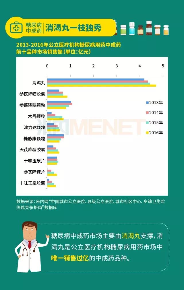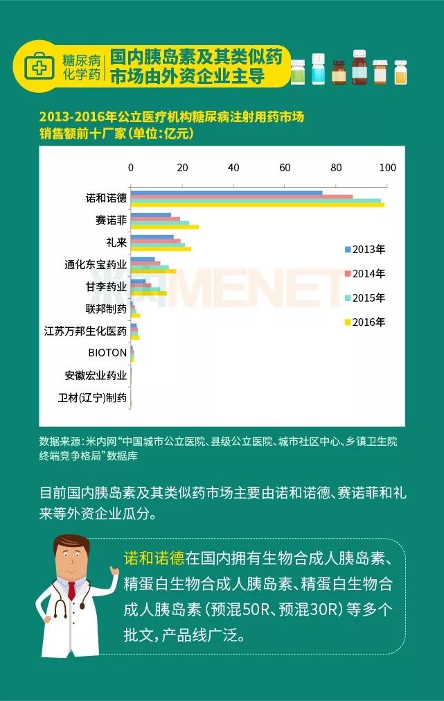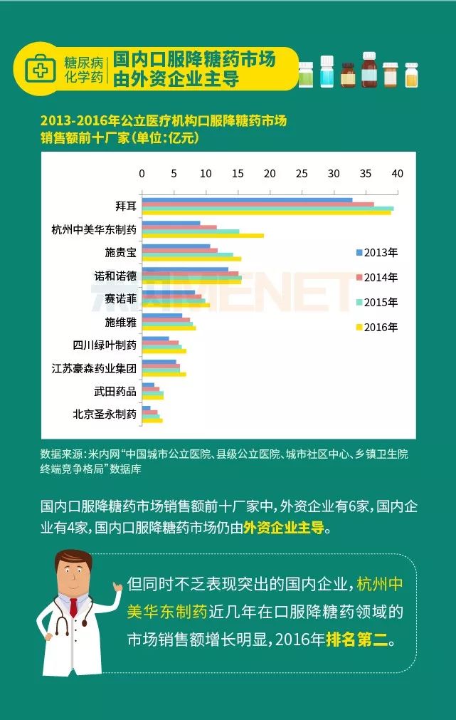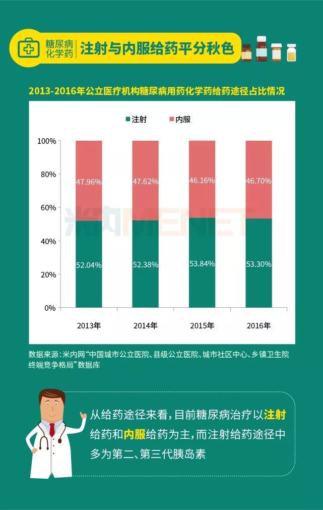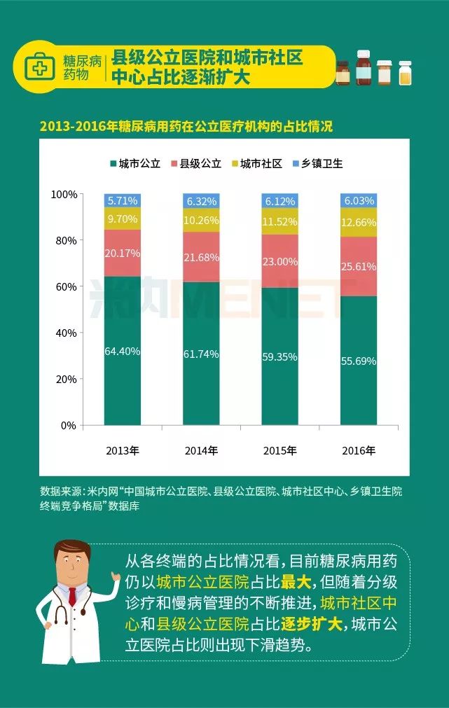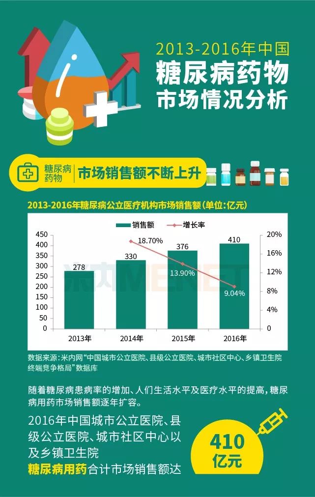 隨著糖尿病患病率的增加、人民生活水平以及醫療水平的提高,糖尿病用藥市場銷售額逐年擴容,2016年城市公立醫院、縣級公立醫院、城市社區中心以及鄉鎮衛生院糖尿病用藥合計市場銷售額達410億元。