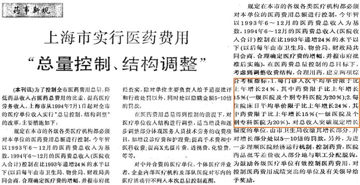 上海。1994年,上海推出“總量控制,結(jié)構(gòu)調(diào)整”政策,把控制藥品費(fèi)用比重作為改革的目標(biāo)之一作為提了出來。