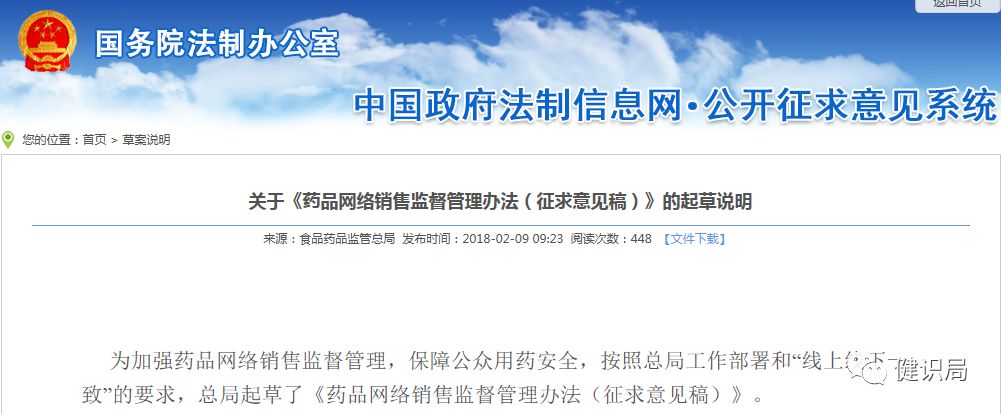 但網售藥品監管新政并非全無回旋余地。CFDA《通知》介紹:社會各界可于2018年3月12日前,通過登錄中國政府法制信息網,進入首頁主菜單的“立法意見征集”欄目提出意見。