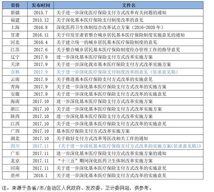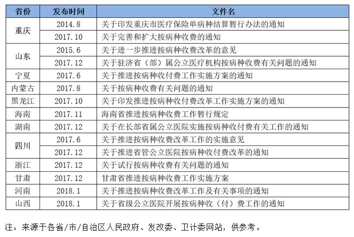 按病種付費(fèi)來勢洶洶,各省發(fā)文密度不低于兩票制 近幾年來,國家醫(yī)藥改革的進(jìn)入攻堅(jiān)階段,各項(xiàng)醫(yī)藥改革政策讓人目不暇接,如一致性評(píng)價(jià)、兩票制、鼓勵(lì)創(chuàng)新、醫(yī)保控費(fèi)、藥占比等等,還有一個(gè)“按病種付費(fèi)”的政策雖然早在2010年前后都開始有所提及,但是一直沒有實(shí)際進(jìn)展,與前面提及的一些政策相比聲音也小了很多。 該政策也是近兩年醫(yī)藥改革的一項(xiàng)重磅政策。其實(shí),這一系列政策是組合拳,實(shí)質(zhì)都可以歸為“供給側(cè)改革”。 截止發(fā)稿時(shí)止,除西藏暫未查到按病種付費(fèi)的相關(guān)文件外,大陸地區(qū)其他省份都陸續(xù)有發(fā)布按病種付費(fèi)的相關(guān)政策文件,有的省份是專項(xiàng)政策文件,有的省份是結(jié)合基本醫(yī)療保險(xiǎn)支付改革政策文件進(jìn)行發(fā)布,還有的省份則既有發(fā)布按病種付費(fèi)的專項(xiàng)政策文件又在基本醫(yī)療保險(xiǎn)支付改革政策文件中進(jìn)行闡述。 發(fā)布按病種付費(fèi)的專項(xiàng)政策文件的省份有重慶、山東、內(nèi)蒙古等12個(gè)省市區(qū)。其中,重慶和山東在2014、2015年就已發(fā)布過相關(guān)專項(xiàng)政策文件,在2017年進(jìn)行了進(jìn)一步的更新和完善。 在2017年12月份,湖南、四川、浙江和甘肅先后扎堆發(fā)布相關(guān)政策文件。 此外,還有23個(gè)省份在基本醫(yī)療支付方式改革的相關(guān)政策文件中對(duì)按病種付費(fèi)政策措施的闡述,大多在9-11月密集發(fā)布。