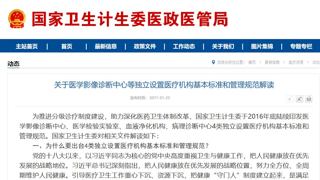 相信很多人都已經知道,在16年底國家衛計委已陸續發文印發關于醫學影像診斷中心、醫學檢驗實驗室、血液凈化機構、病歷診斷中心4類獨立設置醫療機構基本標準和管理規范。