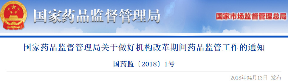 4月13日,國家藥監局發布《關于做好機構改革期間藥品監管工作的通知》(下稱通知)。