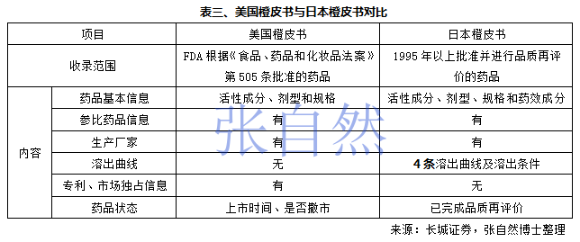 美國橙皮書(orange book)即《經過治療等效性評價批準的藥品》,收錄了經由FDA審批的全部藥品,尤其明確列出新藥所涉及的所有專利以及市場專營保護信息。日本橙皮書(醫療用醫藥品品質情報集)則收錄了已完成評價的部分品種(666個)的理化性質、溶出曲線、實驗方法中文及日文鏈接等。