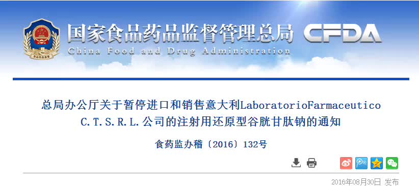 食藥監管總局決定立即暫停進口和銷售意大利Laboratorio Farmaceutico C.T.S.R.L.公司的注射用還原型谷胱甘肽鈉,期間,暫停對該進口品種相關注冊申請的審評審批工作。