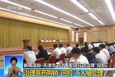 據此次央視的報道,在會上,天津市衛計委曝光了天津某醫院醫務人員接受醫藥代表回扣的行為。按照程序,相關部門對6名涉事醫生給予了黨內嚴重警告,行政記過等黨紀政紀處分,以及警示、提醒、談話處理。
