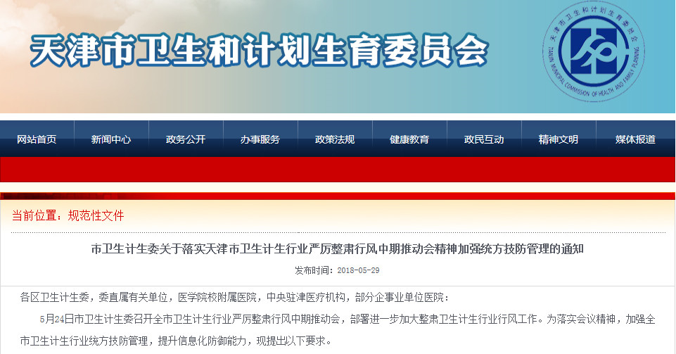 隨后,天津市衛計委于今天印發通知稱,全市二級及以上醫療機構要全面加強技防管理,全部上線使用防統方軟件,進一步加大整肅衛生計生行業行風工作。