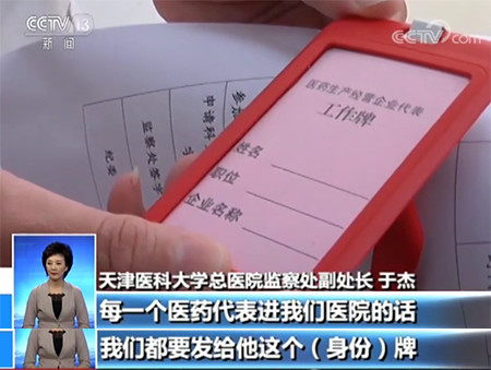 天津市醫科大學總醫院監察處副處長于杰則表示,醫院的所有科室,不允許在其他的區域私自接待醫藥代表,目前出臺了“三定兩有”的規定:規定時間、規定地點、人員還有接待流程。每一個醫藥代表進我們醫院的話,我們都要發給她這個(身份)牌。
