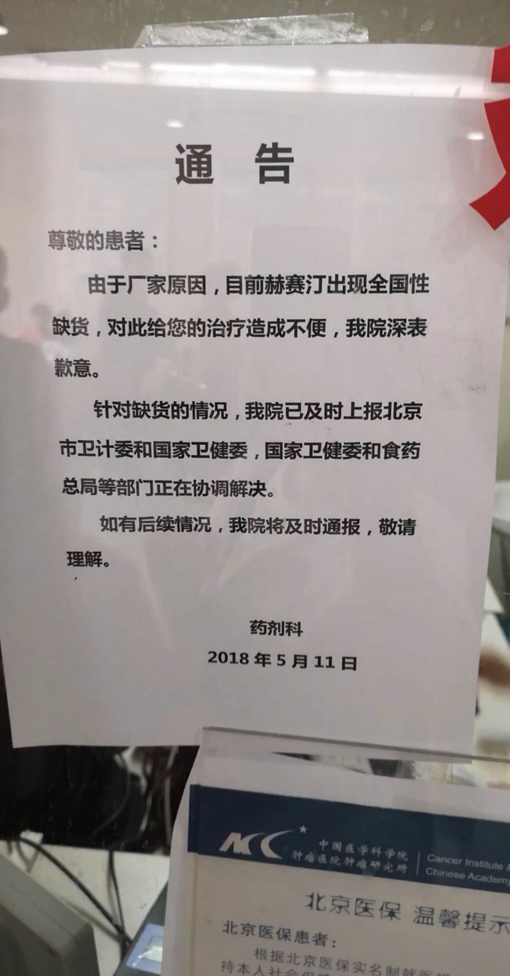 (5月,懸掛于北京中國醫學科學院腫瘤醫院掛號處的赫賽汀斷貨通知)