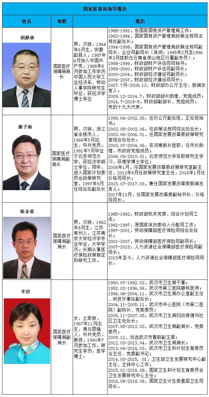 據《人民日報》報道,5月31日,國家醫療保障局正式掛牌。胡靜林任局長,施子海、陳金甫、李滔任副局長。