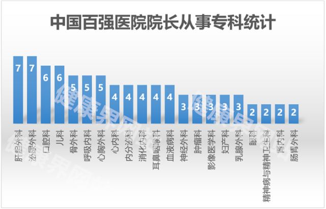 回到本文開頭部分,小編統計了能查到的89位院長的專業,數據確實能支持董家鴻的說法。統計顯示,有7位院長是從事肝膽外科,與泌尿外科并列第一。
