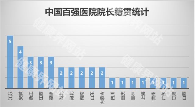 健康界僅查到37位院長的籍貫,但仍然發現了一個規律——華東人“扎堆”。院長數量排名前五的江蘇、安徽、浙江、江西、福建,無一不是華東地區。其中江蘇人最多,達5位。