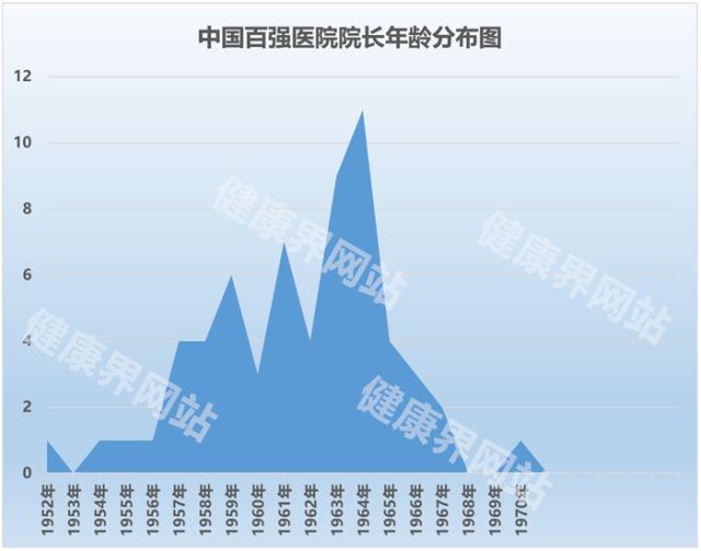 在健康界能查到年齡的62位院長中,大多生于1957-1965年,其中生于1964年即54歲的院長最多,達11位。其次是生于1963年和1961年的,分別為9位和7位。