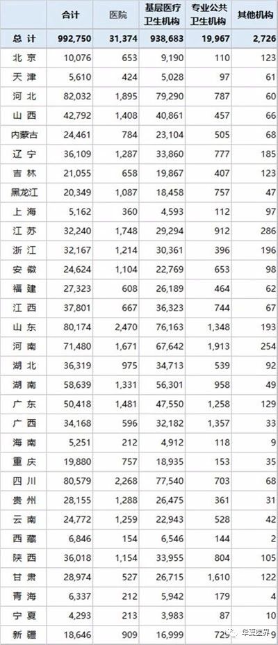 各地區(qū)醫(yī)療衛(wèi)生機(jī)構(gòu)數(shù)見下表。
