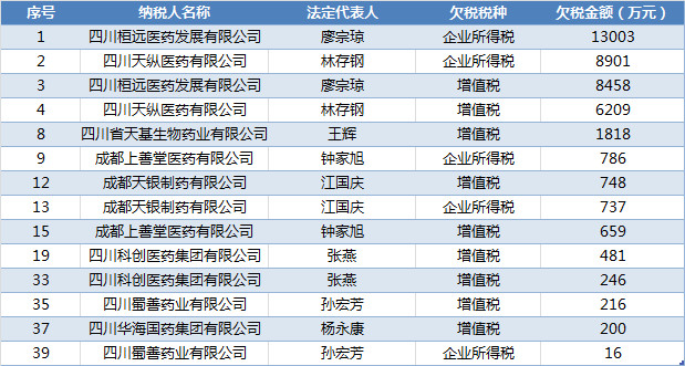 2017年欠稅名單中涉及的藥企: