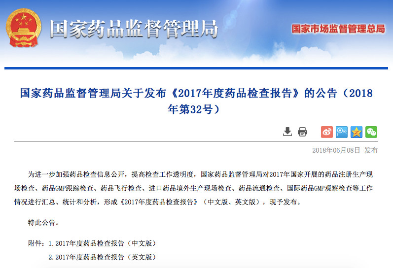 昨日(6月8日),國家藥監局發布《2017年度藥品檢查報告》,對2017年國家開展的藥品注冊生產現場檢查、藥品GMP跟蹤檢查、藥品飛行檢查、進口藥品境外生產現場檢查、藥品流通檢查、國際藥品GMP觀察檢查等工作情況統計分析結果進行公布。