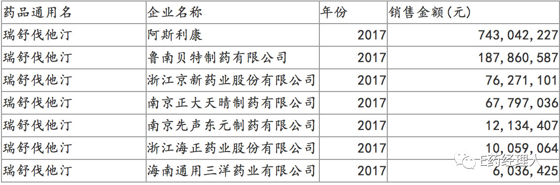 目前市面上已有瑞舒伐他汀的批文數(shù)量有7家,其中海南通用三洋為瑞舒伐他汀膠囊劑型。2017年樣本醫(yī)院銷(xiāo)售格局情況如下: