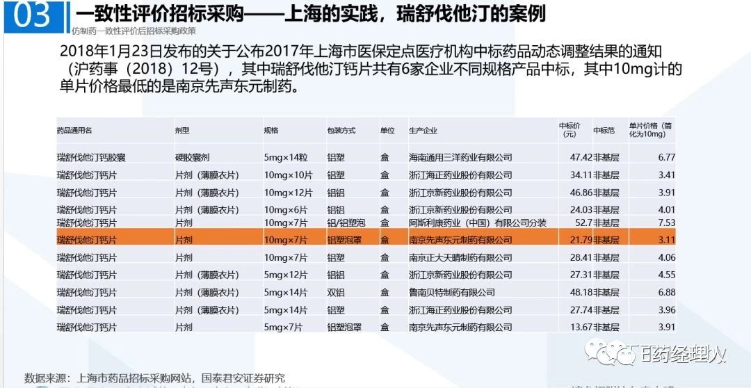 一致性評(píng)價(jià)已經(jīng)從關(guān)注獲批轉(zhuǎn)為關(guān)注市場(chǎng)準(zhǔn)入和放量階段,瑞舒伐他汀鈣片因?yàn)榍?/span>期曲折的審批故事和競(jìng)爭(zhēng)格局的快速演化,已漸成為一致性評(píng)價(jià)明星品種。今日上海的第三批帶量采購(gòu)結(jié)果公示,瑞舒伐他汀位列其中,兩個(gè)規(guī)格均是京新藥業(yè)中標(biāo),對(duì)這一中標(biāo)結(jié)果背后所傳遞出信息的分析,可以使我們更好的觀(guān)察一致性評(píng)價(jià)后的格局演化路徑。