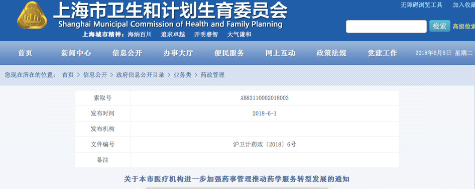 近日,上海市衛計委正式發布《關于本市醫療機構進一步加強藥事管理推動藥學服務轉型發展的通知》。