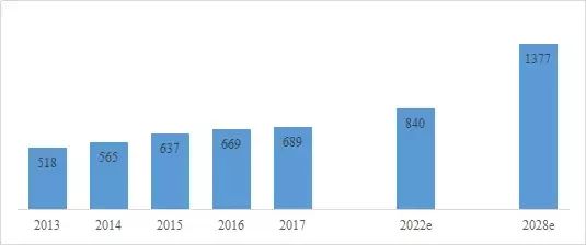 糖尿病作為一種高發慢性病,具有病情不可逆、后期并發癥多等特點,為糖尿病市場帶來了巨大的需求潛力。2017年全球糖尿病藥物市場規模達689億美元,2013-2017年復合增長率為7.4%。未來隨著糖尿病發病人數的增加,藥物的持續創新,弗若斯特沙利文預測糖尿病藥物市場規模在2022年達到907億美元,并在2028年達到1377億美元。