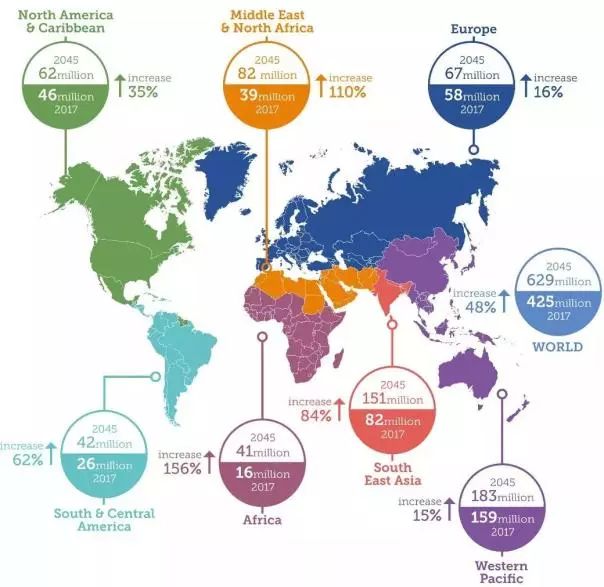 生活方式及人口老齡化的巨大變化加速了糖尿病的蔓延,根據國際糖尿病聯盟發布的全球糖尿病地圖(第8版),2017年全球糖尿病患病率(20~79歲)大約為8.8%,約有4.25億成人糖尿病患者,到2045年,這一數字可能達到6.29億。