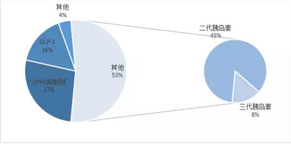 2017年全球糖尿病藥物市場中,胰島素產品約占56%,DPP-4抑制劑類藥物占27%、GLP-1受體激動劑類藥物約16%,其他小分子降糖藥約占4%。