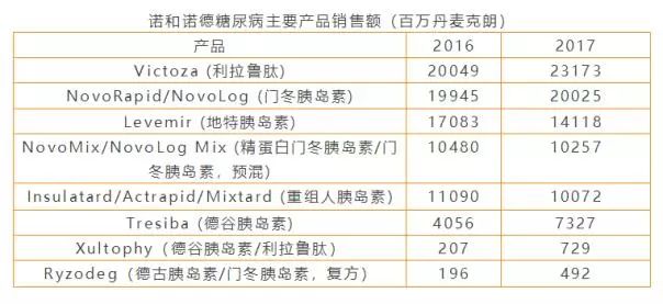 2017年,諾和諾德實現營收1117億丹麥克朗(約180億美元),糖尿病業務占公司總營收的81%,其中胰島素占據70%、GLP-1藥物占26%、其他口服藥物占4%。其主要產品銷售額如下: