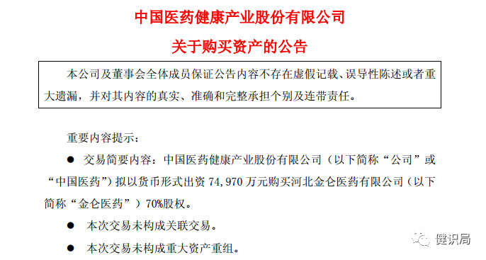 昨天(6月13日)晚間,中國醫(yī)藥健康產業(yè)股份有限公司(以下簡稱“中國醫(yī)藥”)發(fā)布公告,公司擬以貨幣形式出資7.497億元購買河北金侖醫(yī)藥有限公司(以下簡稱“金侖醫(yī)藥”)70%股權。