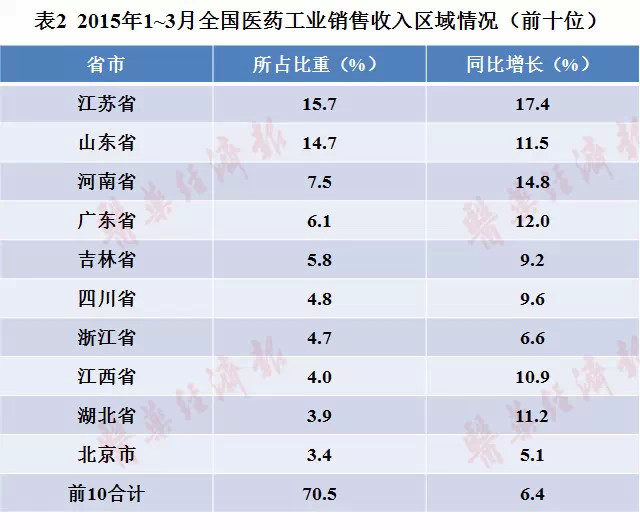 各省市情況中,2015年1~3月份,江蘇省和山東省醫(yī)藥工業(yè)銷售收入依然遙遙領(lǐng)先,分別實(shí)現(xiàn)905.3億元和851.6億元,僅該兩省銷售收入合計(jì)比重就占全國(guó)達(dá)30.4%。前十省市銷售收入合計(jì)為4078.6億元,所占比重為70.5%,平均增速6.4%(見表2)。