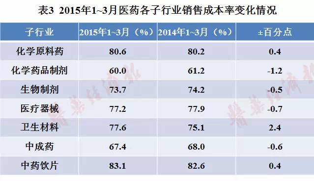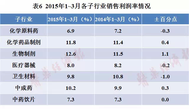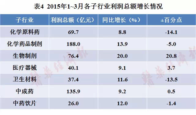 從子行業(yè)看,2015年1~3月各子行業(yè)利潤(rùn)總額增長(zhǎng)基本與1~2月份情況類似。其中,增幅波動(dòng)的冷暖兩極行業(yè)依然是衛(wèi)生材料與生物制劑,衛(wèi)生材料實(shí)現(xiàn)37.4億元,同比增長(zhǎng)11.6%,增幅下降13.5個(gè)百分點(diǎn);而生物制劑則實(shí)現(xiàn)76.4億元,同比增長(zhǎng)20.0%,增幅上漲20.8個(gè)百分點(diǎn)。與2014年相比,生物制劑與衛(wèi)生材料盈利情況冷暖交替,2015年,生物制劑呈利好的形勢(shì)。另一方面,中成藥利潤(rùn)增幅從1~2月的下降態(tài)勢(shì)(-1.01個(gè)百分點(diǎn))轉(zhuǎn)變成3月份的上漲態(tài)勢(shì),增幅上漲0.5個(gè)百分點(diǎn)(見表4)。