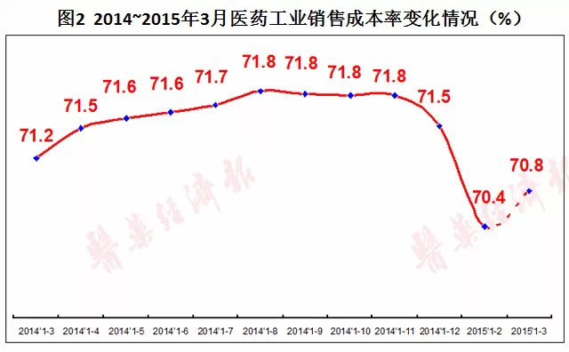 2015年1~2月銷售成本率(70.4%)有所下降后,1~3月該指標(biāo)又有所回升,提高至70.8%,從近一年我國(guó)醫(yī)藥工業(yè)銷售成本率來看,70.8%的成本率雖然低于上一年71%~72%的水平,但成本高位運(yùn)行仍是不爭(zhēng)的事實(shí),制藥工業(yè)的新常態(tài)沒有改變(見圖2)。