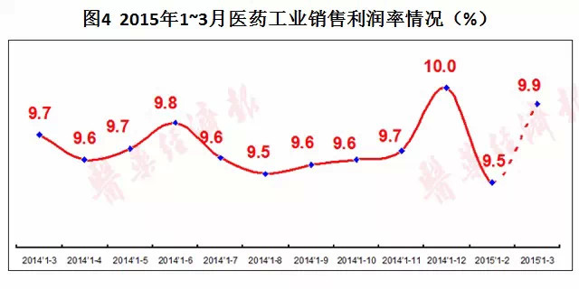 2015年1~3月,我國(guó)醫(yī)藥工業(yè)銷售利潤(rùn)率達(dá)到9.9%(見圖4),較1~2月有了較大幅度的提高,由于1~3月行業(yè)銷售收入增幅明顯小于利潤(rùn)增幅,因此銷售利潤(rùn)率有所提高。但從總體形勢(shì)上來說,1~3月收入與利潤(rùn)增幅較上年同期均有所萎縮。